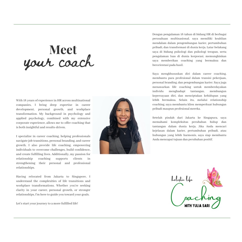 Halo! Saya Wahyu Yulia Sari (Yulia) — coach karier & pengembangan diri dengan pengalaman 18+ tahun di HR & Talent Acquisition di perusahaan multinasional, termasuk Linklaters Singapore & Jakarta. Saya telah menyelesaikan pelatihan coaching profesional di Goal Imagery Coaching Academy, New York, dan saat ini sedang mengumpulkan jam coaching untuk meraih sertifikasi ICF. 🎯 Layanan coaching yang saya tawarkan: • Membantu menemukan arah karier yang sesuai dengan passion & tujuan hidup Anda • Review CV & LinkedIn agar lebih profesional & menarik HR/recruiter internasional • Mock interview dalam Bahasa Indonesia & Inggris untuk meningkatkan performa wawancara • Meningkatkan rasa percaya diri, menghilangkan limiting beliefs, dan menjadi versi terbaik diri Anda • Menggunakan Positive Psychology & mindset work untuk membantu Anda manifestasi karier & hidup yang diinginkan • Mendampingi transisi hidup, termasuk jika Anda berencana pindah & bekerja di luar negeri ✅ Keunggulan saya: • Pengalaman nyata di lingkungan HR internasional & multinasional (Singapura & Indonesia) • Pendekatan coaching yang praktis, personal, dan penuh empati • Sesi tersedia dalam Bahasa Indonesia atau Bahasa Inggris • Jadwal fleksibel & bisa dilakukan secara online (Zoom/Google Meet) 💡 Cocok untuk: fresh graduate, early career professional, mid-career switcher, maupun Anda yang ingin naik level, pindah ke luar negeri, atau mencari kehidupan yang lebih bermakna.