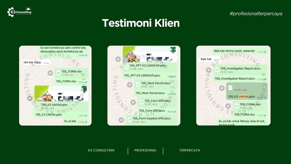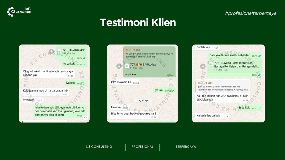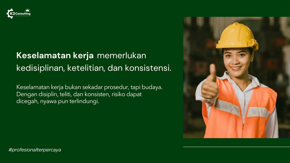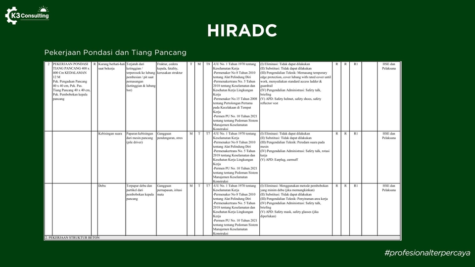 K3 Consulting merupakan penyedia layanan profesional di bidang Kesehatan dan Keselamatan Kerja (K3) yang telah berdiri sejak tahun 2023. Layanan kami mencakup penyusunan berbagai dokumen K3 yang dibutuhkan oleh perusahaan di berbagai sektor industri, mulai dari HIRADC, IBPR, JSA, FMEA, HSE Plan, SOP, hingga dokumen-dokumen K3 lainnya yang bersifat khusus sesuai dengan aktivitas kerja dan kebutuhan operasional perusahaan atau proyek Anda Mengapa harus memakai jasa kami? ▷ Memiliki lisensi Ahli K3 Umum BNSP ▷ Berpengalaman dalam penyusunan dokumen K3 di berbagai sektor ▷ Pengerjaan cepat (4-7hari), rapi dan teliti ▷ Kontrol risiko praktis dan dapat langsung diterapkan ▷ Format Word, Excel, dan PDF, mudah diedit ulang Kompetensi consultant yang kami miliki: ▷ Sertifikasi Ahli k3 Umum BNSP ▷ Lulusan Teknik dari PTN TOP 5 ▷ 50+ klien dan proyek terselesaikan Ruang lingkup proyek yang pernah kami selesaikan: ▷ Instalasi Pengolahan Air Limbah ▷ Konstruksi Bangunan ▷ Instalasi Air Bersih ▷ Pemasangan Billboard atau Reklame ▷ Instalasi Listrik ▷ Pekerjaan Pengukuran dan Bouwplank ▷ Pekerjaan Pemasangan Dinding dan Partisipasi Gedung ▷ Tambang Pasir ▷ Pekerjaan Landscape dan lain sebagainya Dengan didukung oleh tenaga ahli di bidang K3, kami membantu perusahaan dalam mengidentifikasi potensi bahaya, melakukan penilaian risiko, merancang langkah pengendalian yang efektif, serta memastikan kepatuhan terhadap peraturan perundang-undangan. K3 Consulting hadir bukan sekadar untuk menyediakan dokumen, tetapi juga menjadi mitra strategis yang mendukung peningkatan budaya keselamatan kerja, mengurangi potensi kecelakaan, dan meningkatkan produktivitas di tempat kerja.