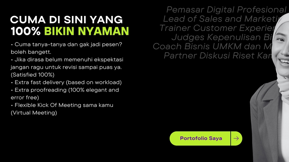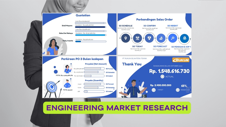 MARKET RESEARCH PROPOSAL - 100% SATISFACTION GUARANTEED - EXCLUSIVE DELIVERY Halo! aku Yunita, berbekal pengalaman riset bisnis selama 4 tahun terakhir di berbagai project riset pasar selama bekerja di perusahaan multinasional dan Start Up. Yunita dapat membantu bisnis kamu untuk melakukan Market Research dengan berbagai metode. Silakan kontak Yunita untuk diskusi lebih lanjut. Benefit Pelanggan: 1. Extra Fast Delivery (Based on Workload). 2. Customer Experience & Quality Control Terbaik. 3. Jaminan Kepuasan (100% Satisfied Revision). 4. Desain dan penulisan yang menarik. 5. Format suka-suka. Silakan pilih Format PDF/WORD/EXCEL/PPT. Langkah Pengerjaan: 1. Kick off Meeting dengan Client. 2. Research Brief. 3. Create Research Plan. 4. Revision. 5. Fieldwork. 6. Analysis and Reporting. Available full-time all-days termasuk weekend. Lets do business together! Langkah Pekerjaan 1. Diskusikan pekerjaan secara detail 2. Pilih jenis paket, durasi, dan harga 3. Kirimkan materi brief/diskusi melalui virtual meeting 4. Lakukan pembayaran sesuai penawaran kerja 5. Order dilakukan sesuai durasi 6. Hasil pekerjaan dikirimkan ke client 7. Ajukan revisi jika dianggap perlu 8. Proposal bisnis akhir