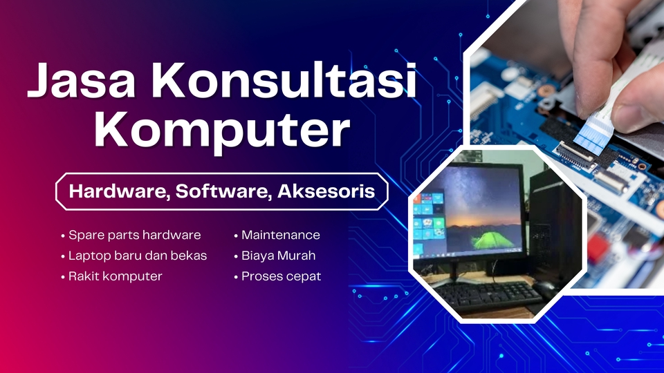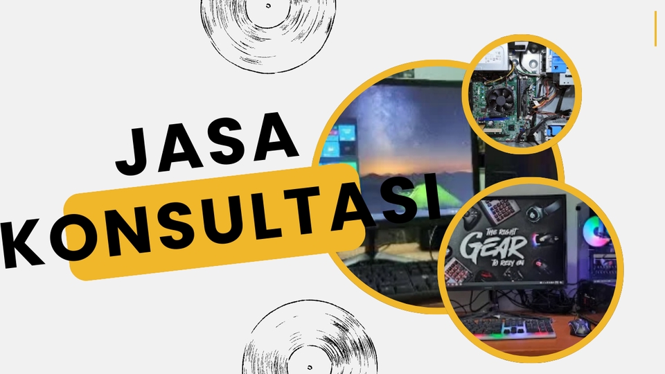 Kuliah Teknik Informatika dan pernah mempunyai usaha servis komputer yang sudah terbiasa dengan hardware dan konsultasi merakit pc sesuai dengan kebutuhan sesuai dengan kondisi keuangan Langkah Pekerjaan Jasa Konsultasi Rakit Komputer: -Diskusi menentukan kebutuhan dan budget -Diskusi menentukan spek yang di butuhkan -Proses memberikan spek yang di inginkan user -Done, jangan lupa memberikan ulasan Langkah Pekerjaan 1. Konsultasi mengenai PC sesuai dengan kebutuhan 2. Membahas mengenai maintenance 3. Memberikan rekomendasi belanja