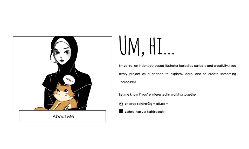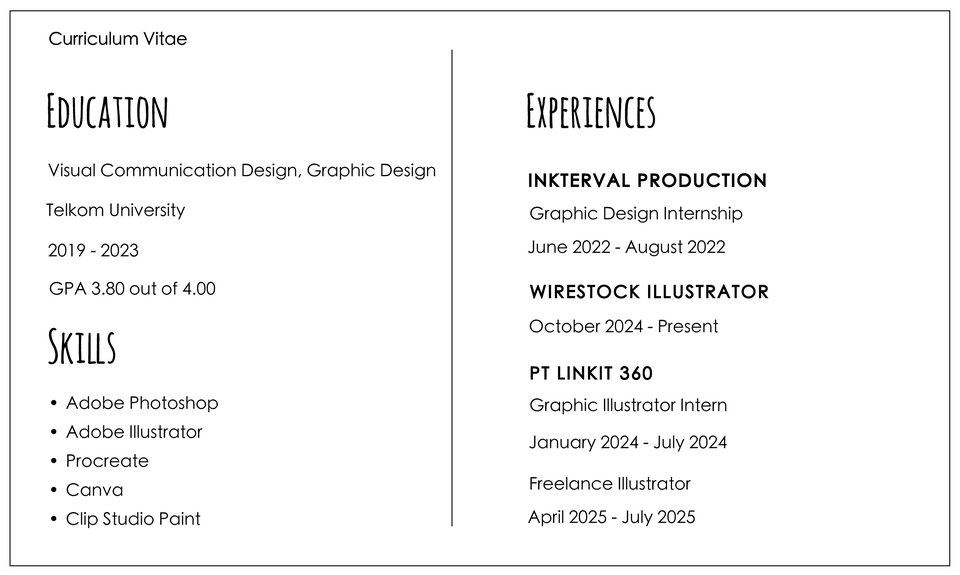 Hai! Aku adalah illustrator lulusan Desain Komunikasi Visual di Universitas Telkom yang kini menetap di kota Bogor. Sebagai illustrator, aku bisa membantu menerjemahkan ide kalian menjadi sebuah produk melalui bahasa visual!