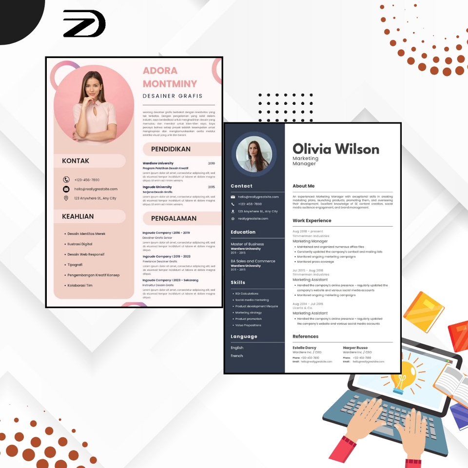 Rp100,0 rbWaktu pengerjaan 1X24 jam jadi Boleh pilih design Dokumen yang akan didapatkan CV/ LAMARAN KERJA: 1. Free Konsultasi 2. Format dalam bentuk PDF, PNG/JPG, Utk beli diluar paket yang ditawarkan, silahkan chat.